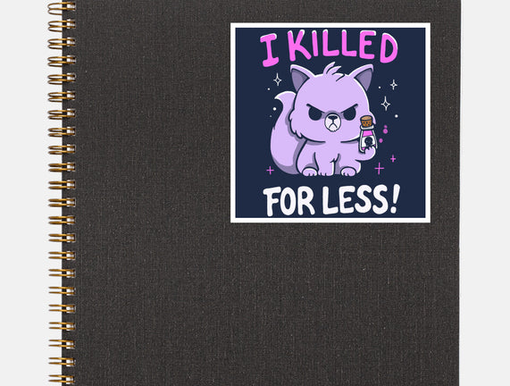 I Killed For Less is a great None Glossy Sticker from our amazing collection of custom fandom inspired products. This product was designed by Vallina84, who is part of our exclusive pop-culture inspired artist community.