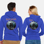 50% cotton, 50% polyester. Classic fit. Metal zipper and pouch pockets. Artwork printed on the back. Wash inside-out in cold water and hang on tumble dry on low heat to maximize the life of your sweatshirt.