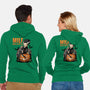 50% cotton, 50% polyester. Classic fit. Metal zipper and pouch pockets. Artwork printed on the back. Wash inside-out in cold water and hang on tumble dry on low heat to maximize the life of your sweatshirt.