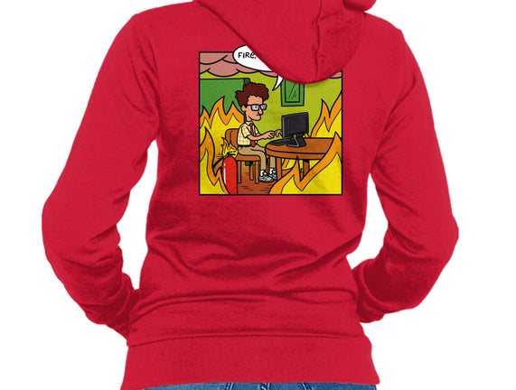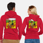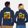 50% cotton, 50% polyester. Classic fit. Metal zipper and pouch pockets. Artwork printed on the back. Wash inside-out in cold water and hang on tumble dry on low heat to maximize the life of your sweatshirt.