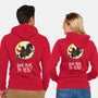 50% cotton, 50% polyester. Classic fit. Metal zipper and pouch pockets. Artwork printed on the back. Wash inside-out in cold water and hang on tumble dry on low heat to maximize the life of your sweatshirt.