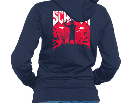 50% cotton, 50% polyester. Classic fit. Metal zipper and pouch pockets. Artwork printed on the back. Wash inside-out in cold water and hang on tumble dry on low heat to maximize the life of your sweatshirt.