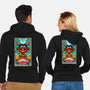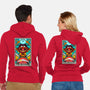 50% cotton, 50% polyester. Classic fit. Metal zipper and pouch pockets. Artwork printed on the back. Wash inside-out in cold water and hang on tumble dry on low heat to maximize the life of your sweatshirt.