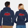 50% cotton, 50% polyester. Classic fit. Metal zipper and pouch pockets. Artwork printed on the back. Wash inside-out in cold water and hang on tumble dry on low heat to maximize the life of your sweatshirt.