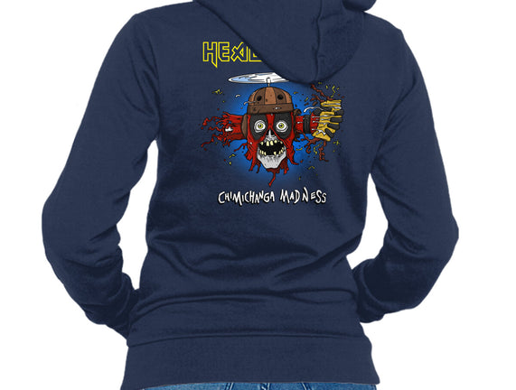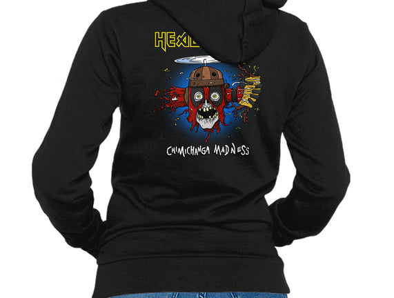 50% cotton, 50% polyester. Classic fit. Metal zipper and pouch pockets. Artwork printed on the back. Wash inside-out in cold water and hang on tumble dry on low heat to maximize the life of your sweatshirt.