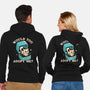 50% cotton, 50% polyester. Classic fit. Metal zipper and pouch pockets. Artwork printed on the back. Wash inside-out in cold water and hang on tumble dry on low heat to maximize the life of your sweatshirt.