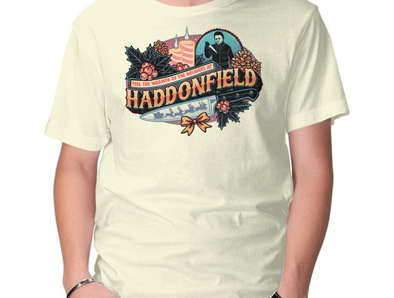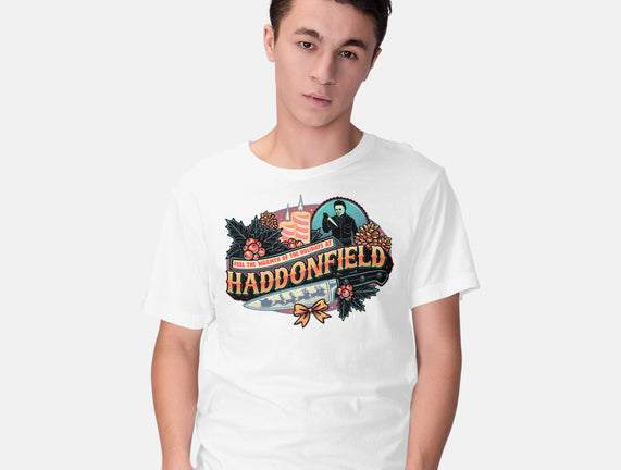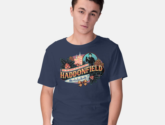 Haddonfield Holidays is a great Mens Basic Tee from our amazing collection of custom fandom inspired products. This product was designed by glitchygorilla, who is part of our exclusive pop-culture inspired artist community.