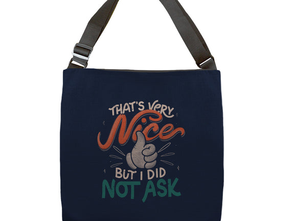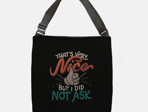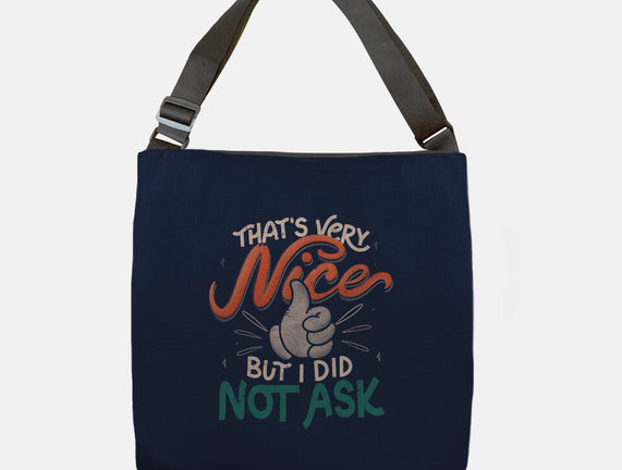 I Did Not Ask is a great None Adjustable Tote Bag from our amazing collection of custom fandom inspired products. This product was designed by tobefonseca, who is part of our exclusive pop-culture inspired artist community.