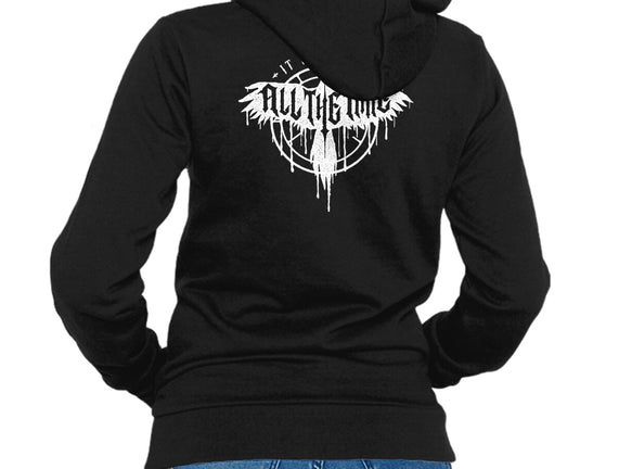 50% cotton, 50% polyester. Classic fit. Metal zipper and pouch pockets. Artwork printed on the back. Wash inside-out in cold water and hang on tumble dry on low heat to maximize the life of your sweatshirt.