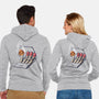 50% cotton, 50% polyester. Classic fit. Metal zipper and pouch pockets. Artwork printed on the back. Wash inside-out in cold water and hang on tumble dry on low heat to maximize the life of your sweatshirt.