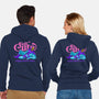 50% cotton, 50% polyester. Classic fit. Metal zipper and pouch pockets. Artwork printed on the back. Wash inside-out in cold water and hang on tumble dry on low heat to maximize the life of your sweatshirt.