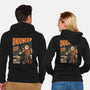 50% cotton, 50% polyester. Classic fit. Metal zipper and pouch pockets. Artwork printed on the back. Wash inside-out in cold water and hang on tumble dry on low heat to maximize the life of your sweatshirt.