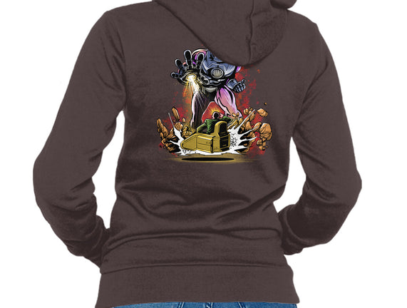 50% cotton, 50% polyester. Classic fit. Metal zipper and pouch pockets. Artwork printed on the back. Wash inside-out in cold water and hang on tumble dry on low heat to maximize the life of your sweatshirt.