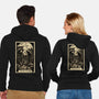 50% cotton, 50% polyester. Classic fit. Metal zipper and pouch pockets. Artwork printed on the back. Wash inside-out in cold water and hang on tumble dry on low heat to maximize the life of your sweatshirt.