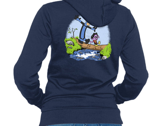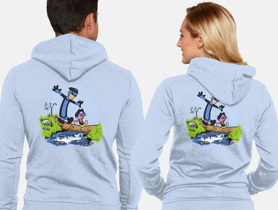 50% cotton, 50% polyester. Classic fit. Metal zipper and pouch pockets. Artwork printed on the back. Wash inside-out in cold water and hang on tumble dry on low heat to maximize the life of your sweatshirt.