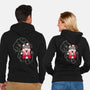 50% cotton, 50% polyester. Classic fit. Metal zipper and pouch pockets. Artwork printed on the back. Wash inside-out in cold water and hang on tumble dry on low heat to maximize the life of your sweatshirt.