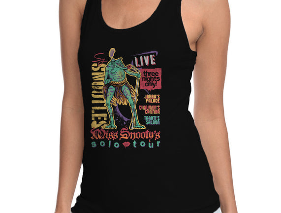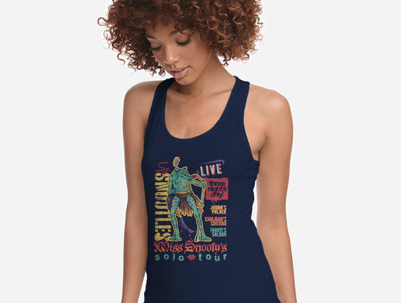 Miss Snooty's Solo Tour is a great Womens Racerback Tank from our amazing collection of custom fandom inspired products. This product was designed by Wheels, who is part of our exclusive pop-culture inspired artist community.